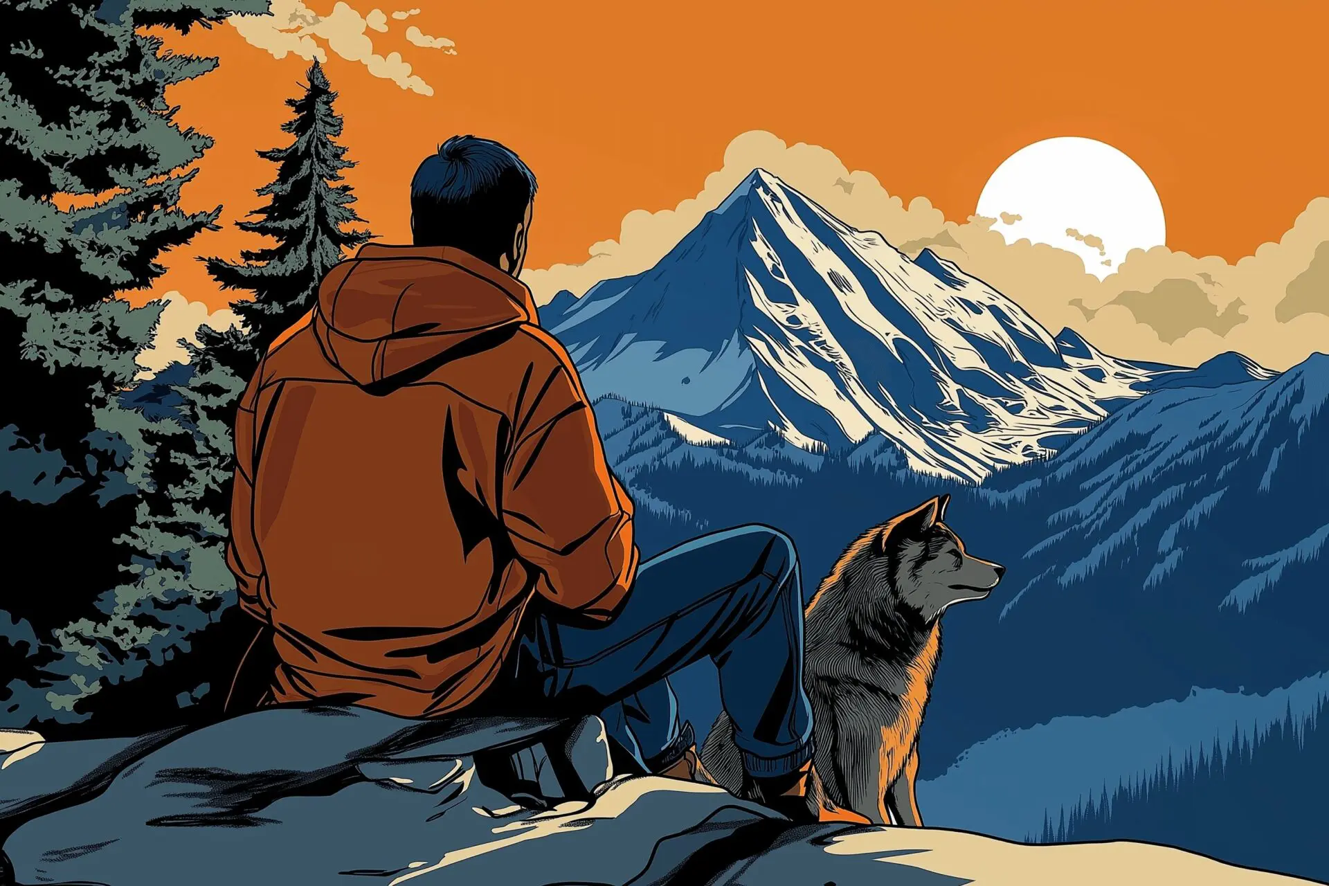 a man and a lone wolf overlooking a mountain